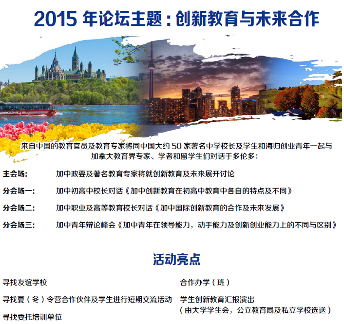 为进一步拓展教育全球化视野,推进教育国际化,促进加中两国创新教育之间的交流与合作,增进加中两国政府教育机构、加中两国院校间及留学生、海归青年之间的友好互动,由中华人民共和国驻多伦多总领馆(拟),加拿大安大略省教育厅(拟),加拿大纽宾士域省教育厅, 加拿大约克大学,中国民办教育协会,中国教育国际交流协会中学分会,中国-北京圣陶创新与发展研究院,中国青年海归协会,加煌国际教育集团及加中创新教育联盟联合举办的2015加中创新教育论坛-暨加中著名校长对话峰会将于2015年9月28日至10月8日在加拿大多伦多举行。