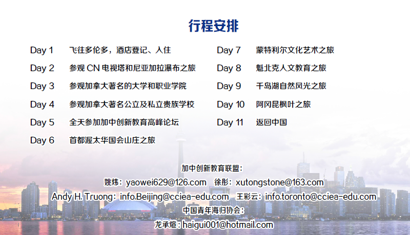 朋友们,让我们一起相聚在多伦多《加中创新教育论坛》-暨加中著名校长对话峰会上,加强两国教育界之间的对话与沟通,探讨创新教育,促进合作与可持续发展。